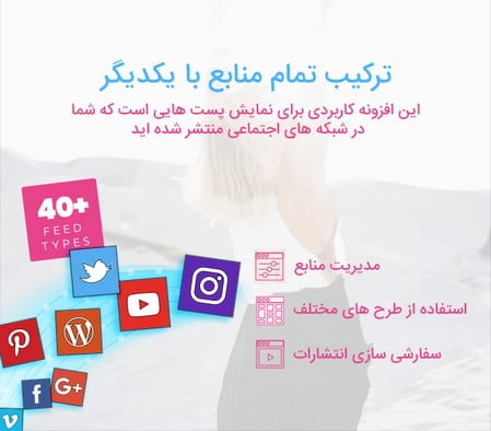 با استفاده از این افزونه بسیار کاربردی برای نمایش پست هایی که شما در شبکه های اجتماعی گوناگون مانند فیس بوک ، اینستاگرام …. منتشر کرده اید و حالا قصد دارید بازدیدکنندگان وبسایت شما از انتشار این پست ها مطلع گردند و در واقع نمایی از پست های منتشر شده شما در شبکه های اجتماعی را در وبسایت تان بشکلی بسیار زیبا و خلاق و در کنار هم مشاهده کنند.