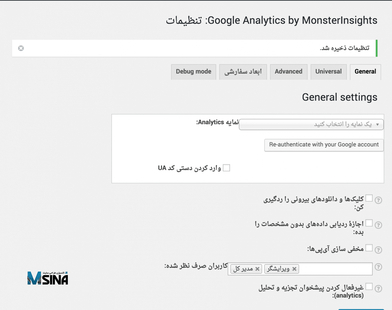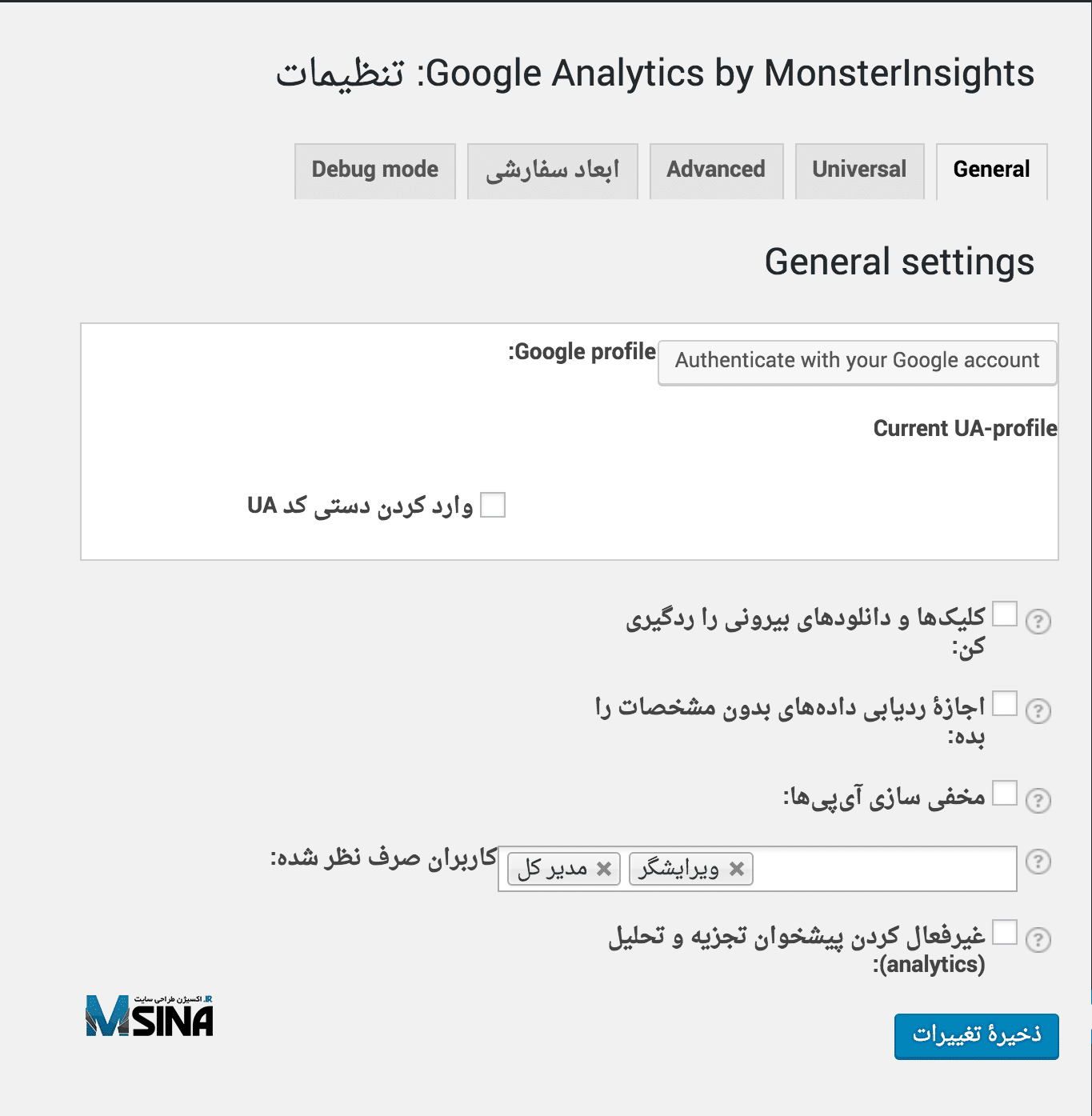 بعد از این که افزونه را از اکسیژن طراحی سایت Msina دریافت و نصب و فعال کردید به قسمت تنظیمات بروید و بر روی دکمه Authenticate with your Google account کلیک نمایید.