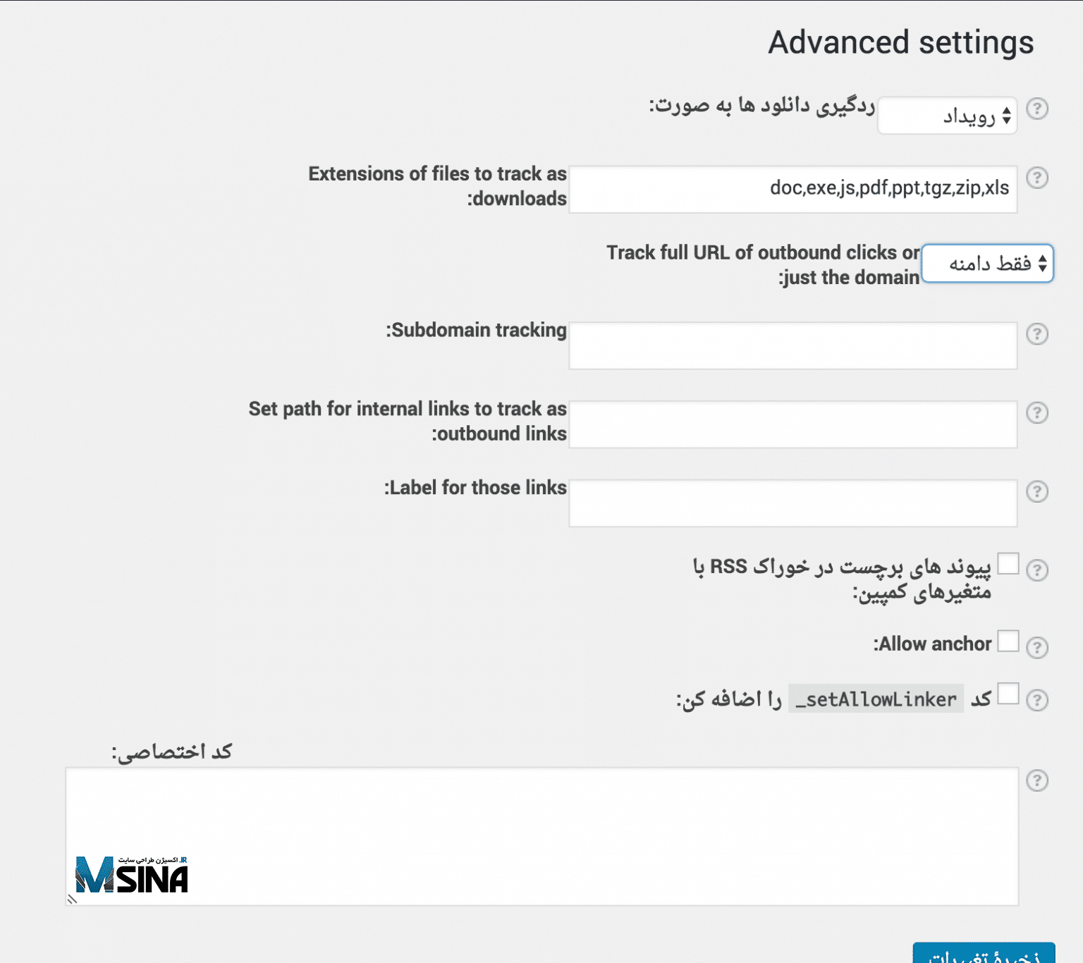 Extensions of files to track as downloads: در این بخش می توانید فرمت فایل هایی که میخواهید در نتایج دانلود در google analytics را تعیین کنید.