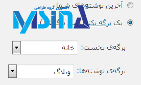بعد از ایجاد برگه به مسیر: پیشخوان > تنظیمات > خواندن، رفته و همانند تصویر زیر، برگهها را برای نمایش در برگهی نخست و وبلاگ، گزینش کنید: