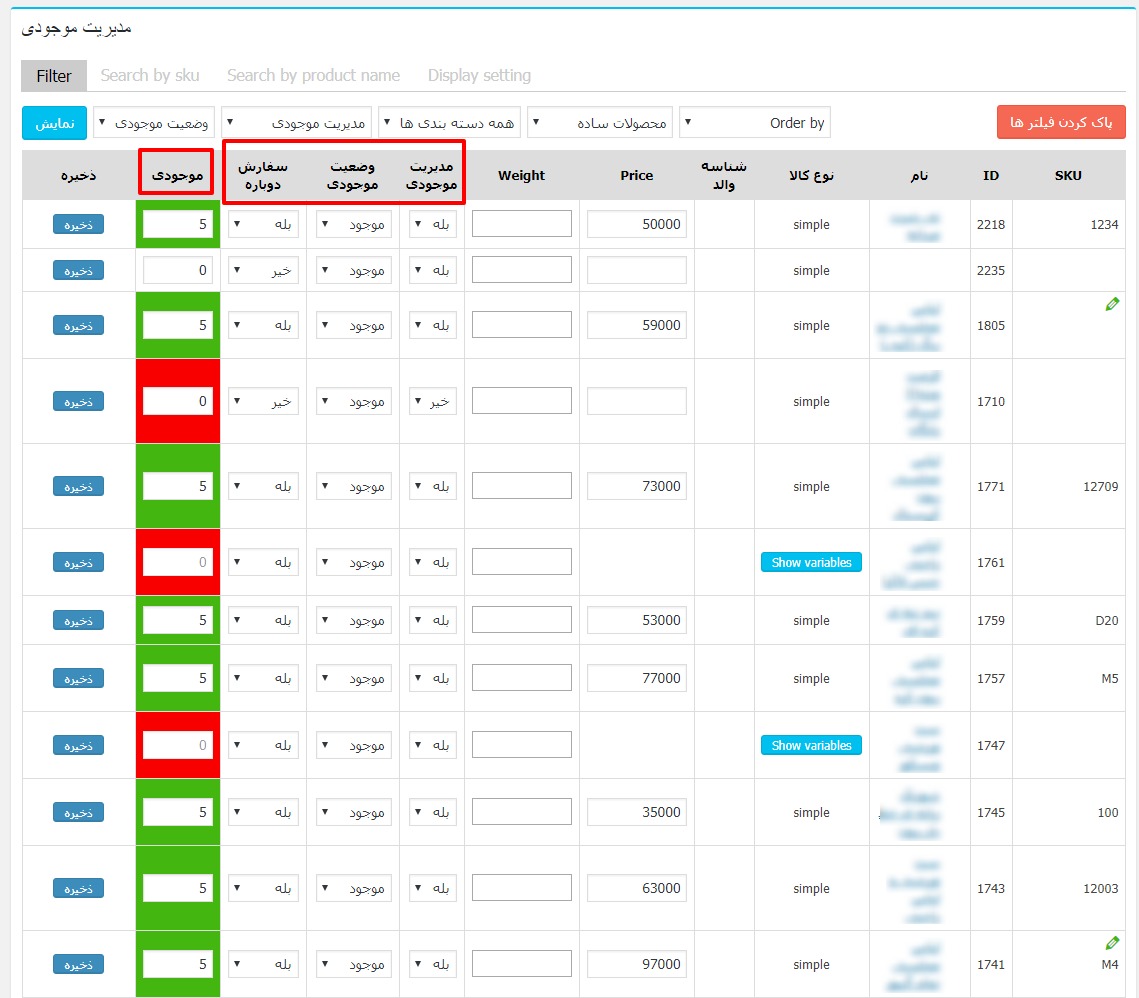 همان‌طور که در تصویر بالا می‌بینید، تمامی محصولات فروشگاه را به همراه اطلاعاتی به نمایش می‌گذارد و موجودی را با فیلدهای رنگی تعیین می‌کند. همچنین اگر بخواهید می‌توانید اطلاعات موجودی را از همین بخش تغییر داده و بر روی دکمه ذخیره کلیک کنید.